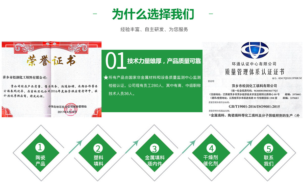 萍鄉(xiāng)市松潤化工填料有限公司位于江西省萍鄉(xiāng)市國家經濟開發(fā)區(qū)西區(qū),是專業(yè)生產、經營陶瓷、聚丙烯、金屬填料、塔內件、水處理濾板、濾管、濾料、瓷球、分子篩、催化劑、活性炭、蜂窩陶瓷、瓷質耐磨托輥等系列產品的民營企業(yè)。所有產品由國家非金屬材料和設備質量監(jiān)測中心監(jiān)測檢驗認證。公司現有員工280人,其中有高、中級職稱技術人員36人。工藝先進,技術力量雄厚,產品質量可靠,配...